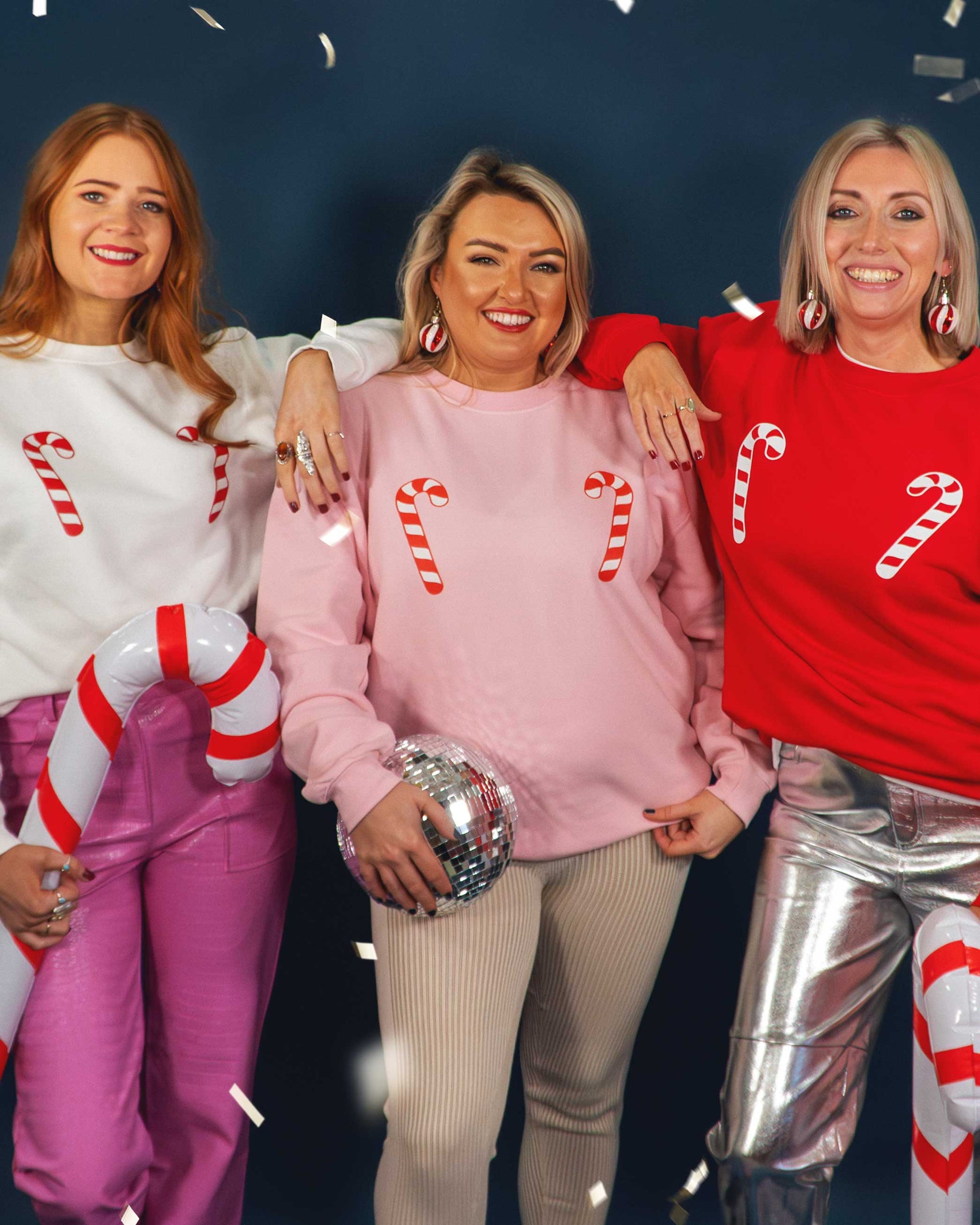 Choose from White, Red or Baby Pink sweaters in a unisex style fit.