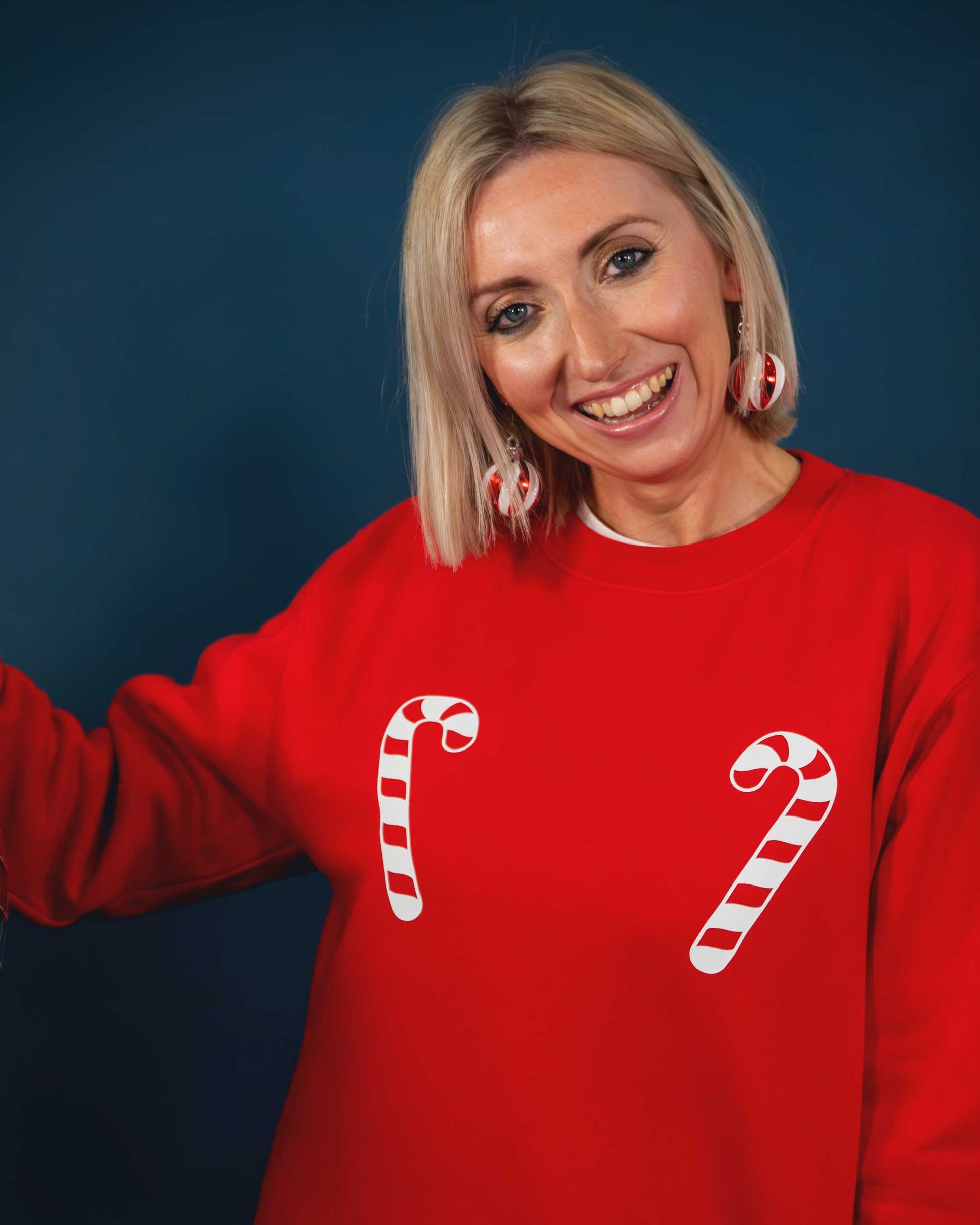 Each top is printed to order just for you in our Manchester studio with two candy canes printed on the chest.