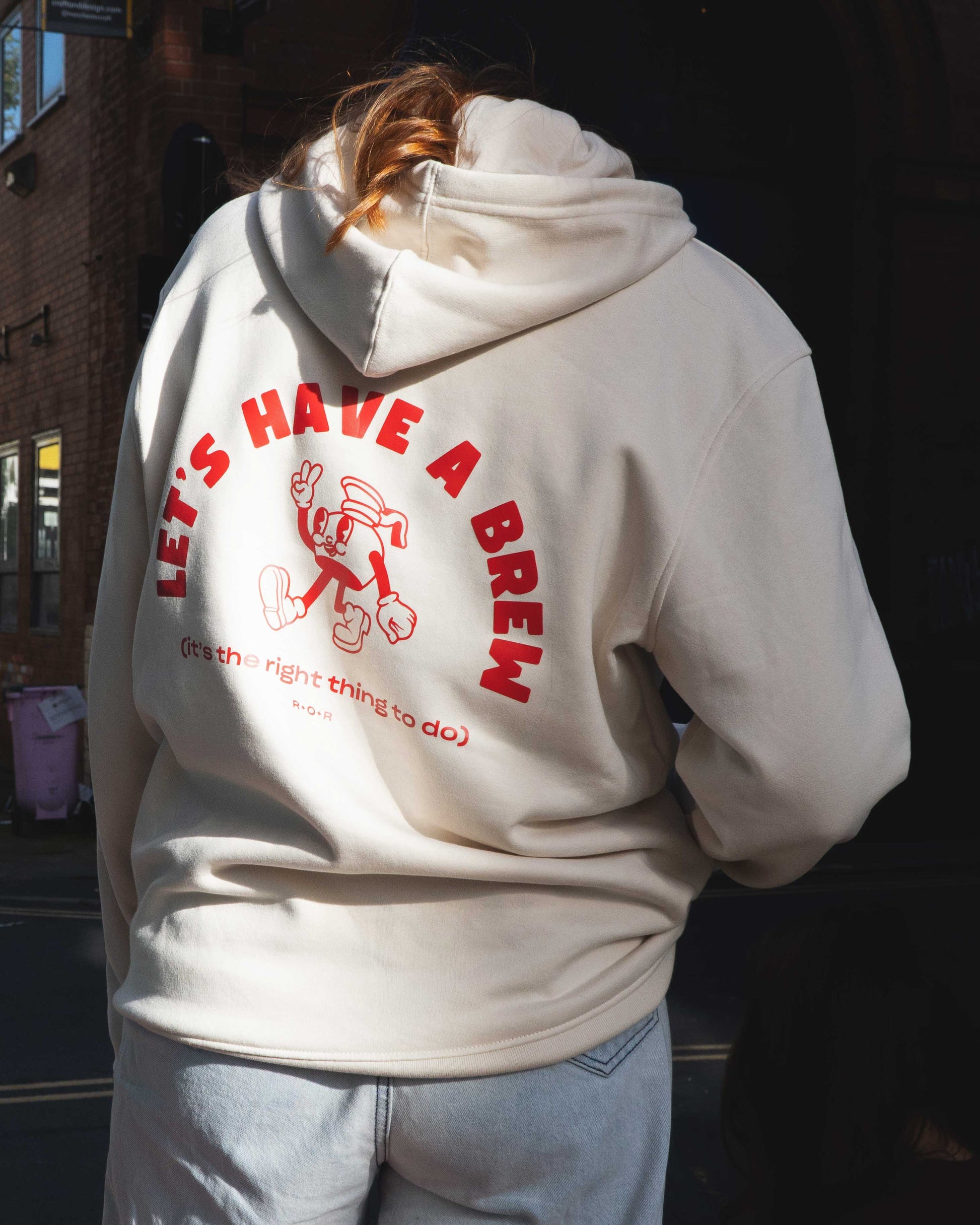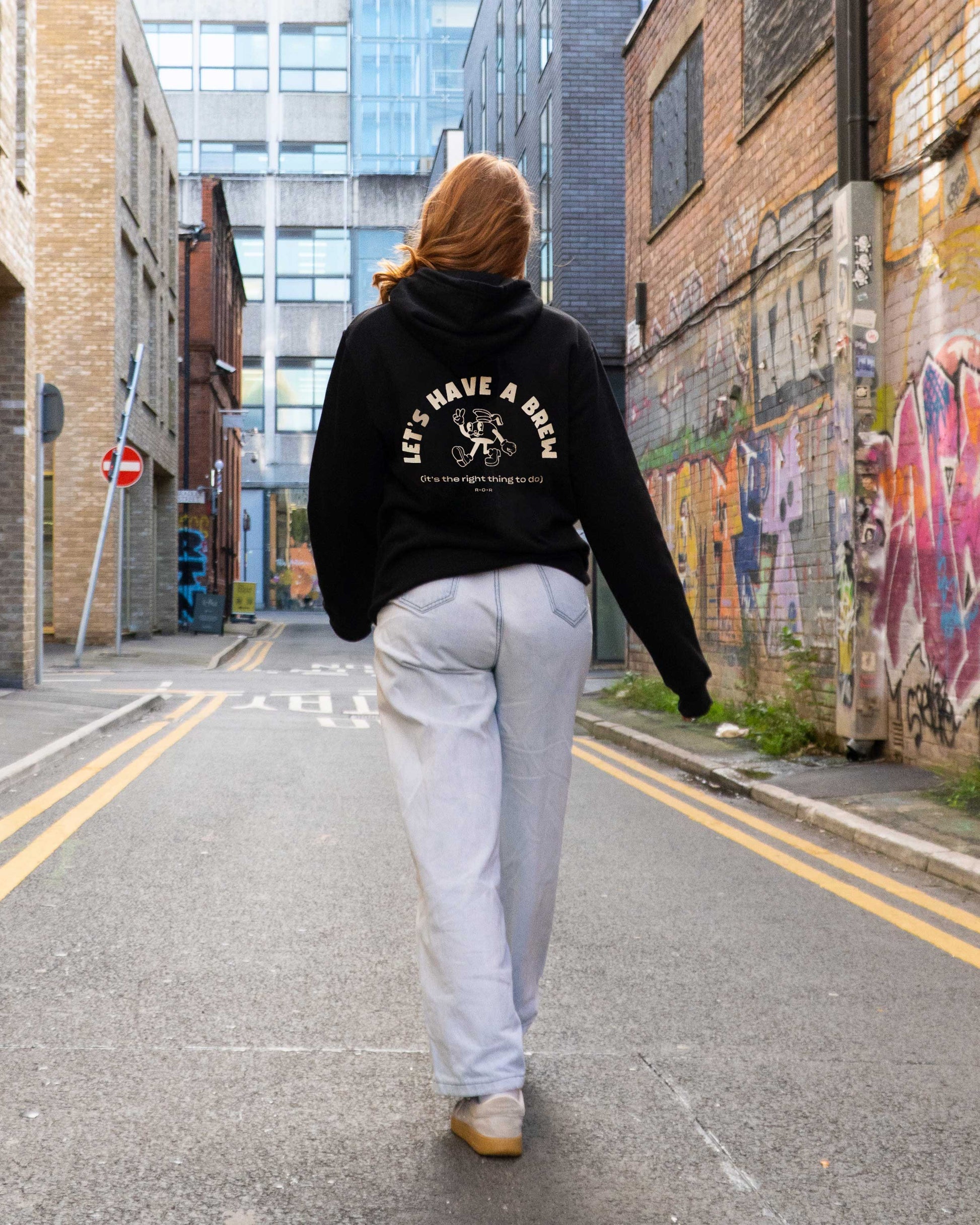 Cosy up in this super soft, back print hoodie that is the perfect combo of comfy and casual. Each top is printed to order just for you in our Manchester Studio with the slogan "Let's have a brew, it's the right thing to do" and a cute, retro style coffee character.