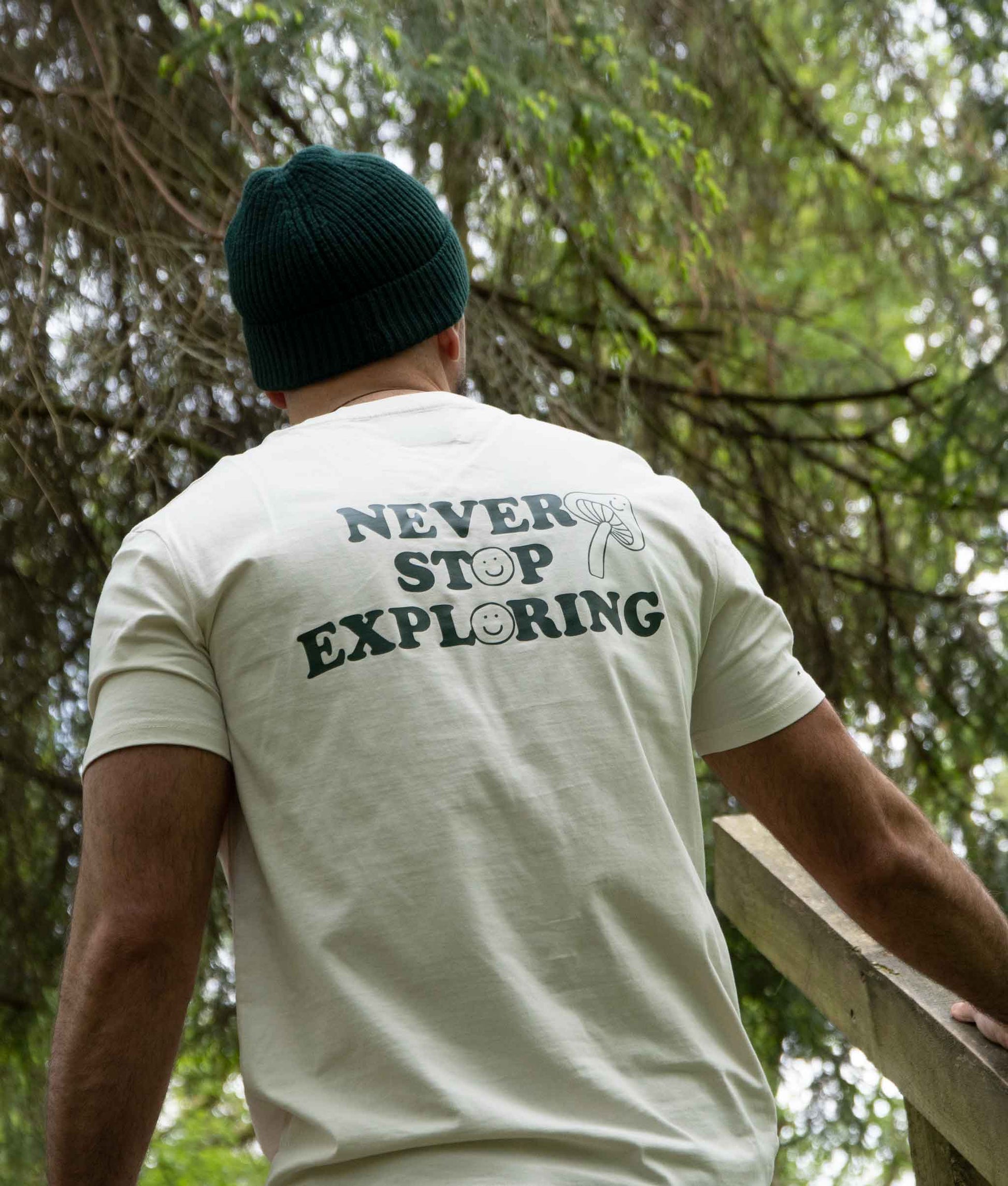 Each t-shirt is printed to order on the back with the large slogan "never stop exploring" including smiley faces. The front breast pocket includes a cute, happy mushroom illustration.