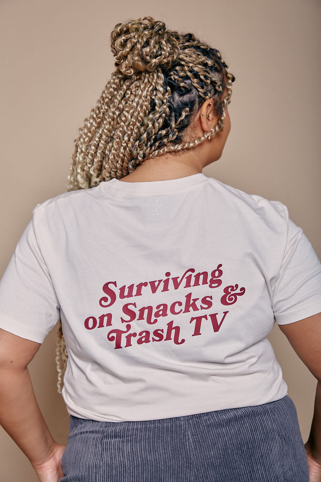 Indulge in nostalgia and statement fashion with our Snacks and TV T-Shirt. Featuring a retro slogan that resonates with all binge-watchers and junk food enthusiasts, this comfortable tee is perfect for lounging or running errands. Embrace your love for snacks and trash TV in style.
