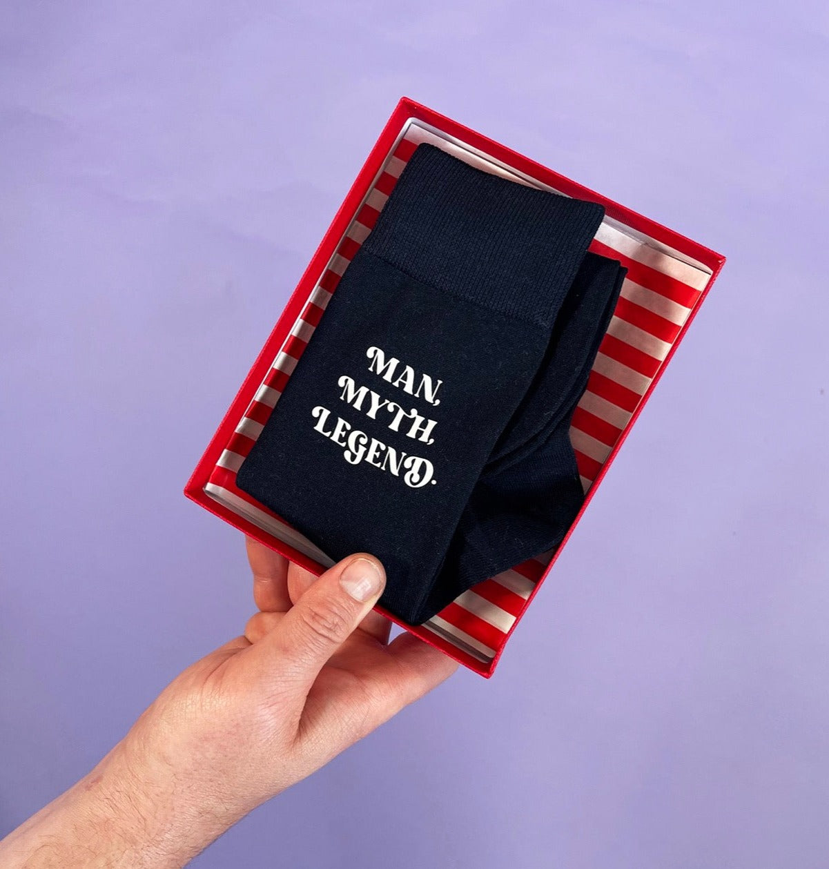 Each pair of socks are printed to order just for you and packaged in a striped bag. Gift Box not included.